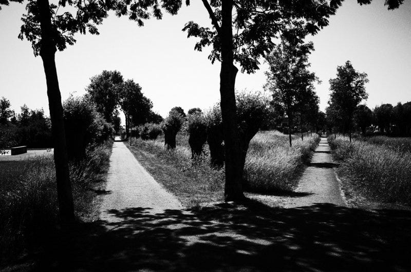 My favorite photograph still varies a bit. Every year you develop yourself as a photographer. That includes images that - at that moment - belong to your best work. And sometimes there are images from years ago that have lost none of their power of expression. Right now, my favorite image is a photo I took in April 2020. A photograph from my Descended Silence project where you can see a split in a walking path. Very coincidentally, this is called the Borgstijn Trail. Turns out my family used to have a piece of land here. In that split you can see the choice we often have to make as humans. Do we go left or do we go right. On the left is a path in sunlight, coming out to a tunnel with light at the end (hmmmm) and on the right the path goes through some dark periods but the trees yield. If you look closely you can see another person walking on the right. This meaning was given to me by someone only later and then the photo came to life for me even more. For this "story," I found it an intriguing image which at first glance appears to be an edit with mirroring. Just shows that storytelling is possible even with one image. Even unconsciously.