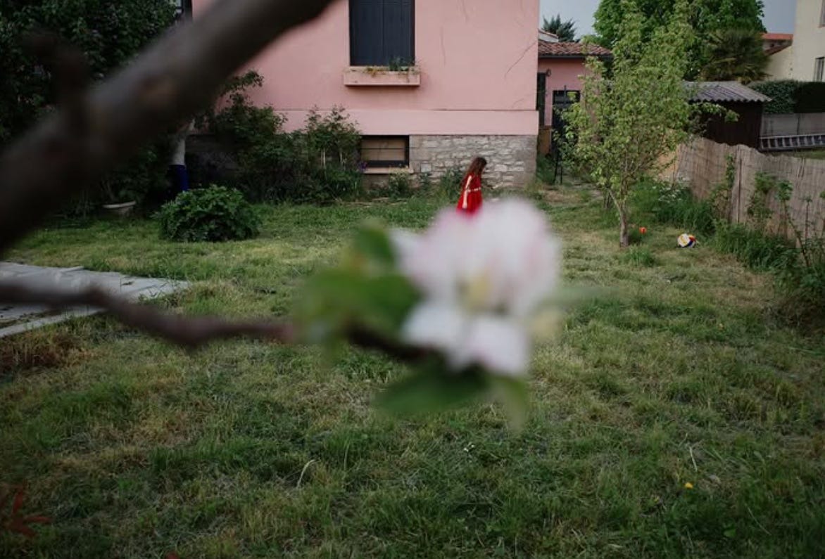 It’s a photo of my daughter, seen from afar, partly hidden behind a blooming branch in a garden. She’s walking along the back wall of the house, wearing red. The flower in the foreground is out of focus, soft and bright. That image says everything about me, it holds all there is to know.