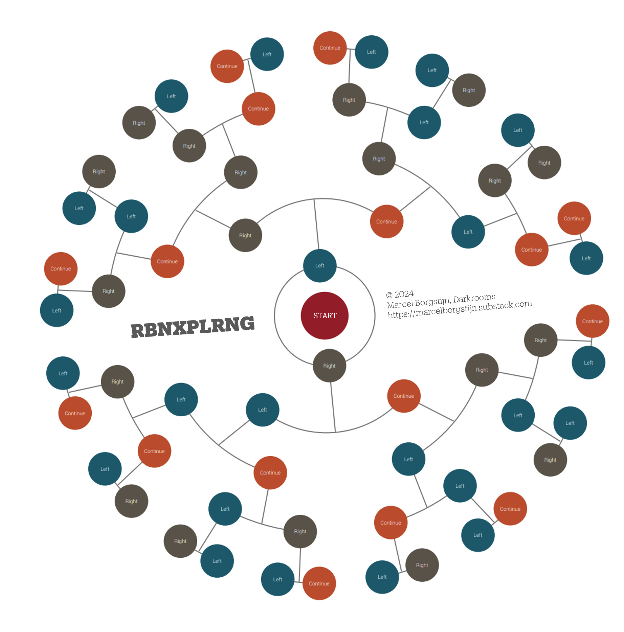 The idea is simple. Start on a certain spot in your hometown. Somewhere between your first step and the first corner, you need to take a photo. This can be anything, like a building, a person, a view over the park. It’s all up to you. Then look at the schema and choose to walk to the left or right on the nearest corner. Take another photo and see what choices you now have to choose from.