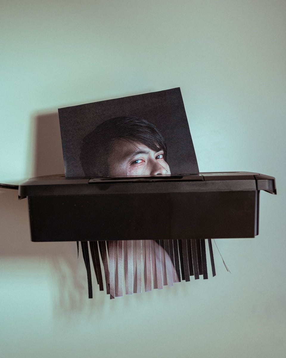 PhotoTalk 12: a self-portrait going through a shredder. The photographer explains: this is about self-acceptance, about stopping seeking validation from others. Those are real tears.